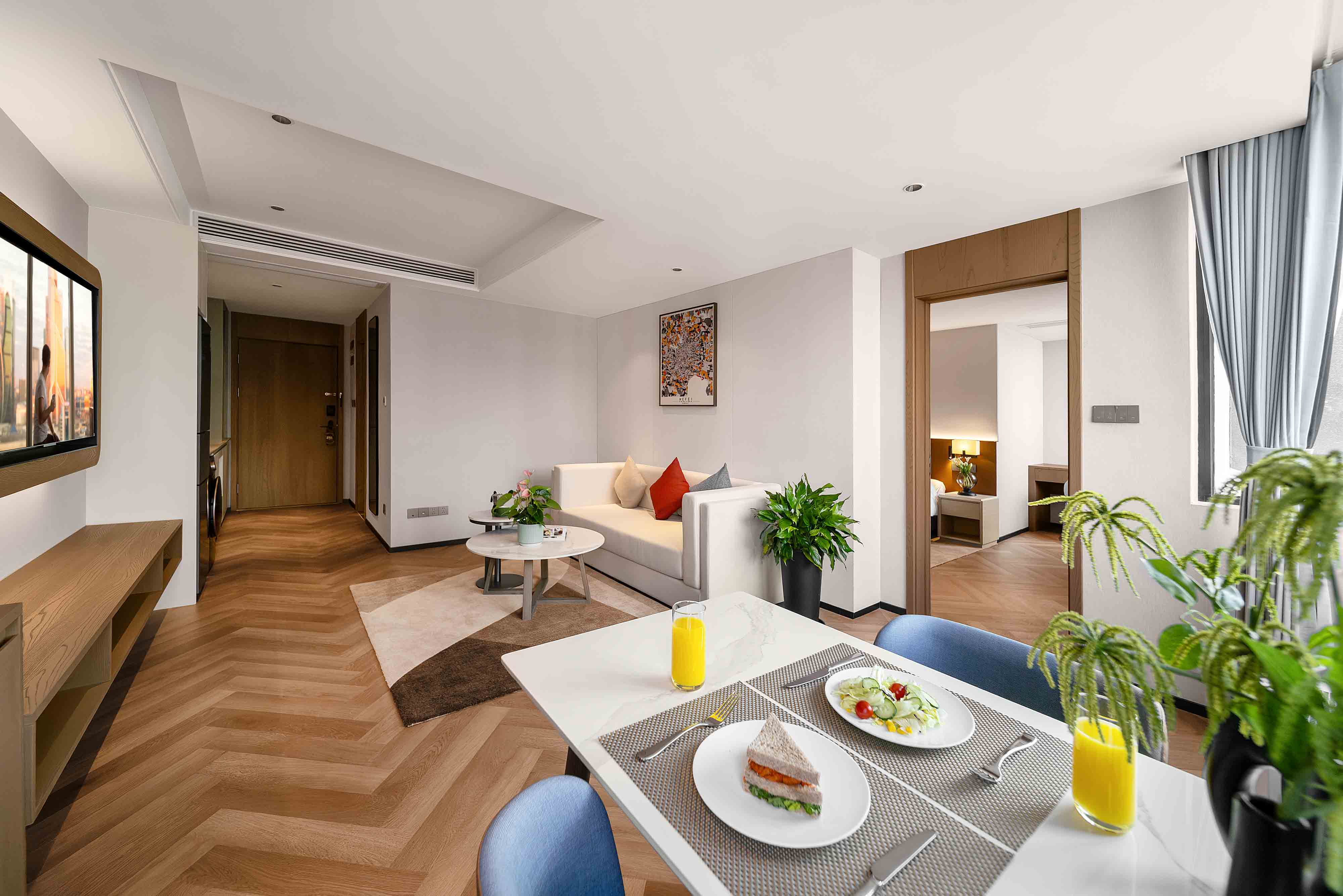 The meticulously designed property offers 182 well-appointed suites that blend contemporary style with intuitive comfort, ranging from deluxe studio apartments to spacious two-bedroom suites—each tailored to flexibly accommodate solo travelers, couples, and families alike. Subtle Hefei-inspired touches are woven into the soft furnishings, including artwork that reflects the city’s unique culture. Every suite embodies Citadines’ “thoughtfully designed home” philosophy, with a living area, dedicated dining space, fully equipped kitchen (complete with a refrigerator and washer-dryer combo), and a premium audio-visual system. From daily routines to leisure moments, these amenities recreate the warmth and convenience of home in every detail, easing concerns for both short stays and extended residences.