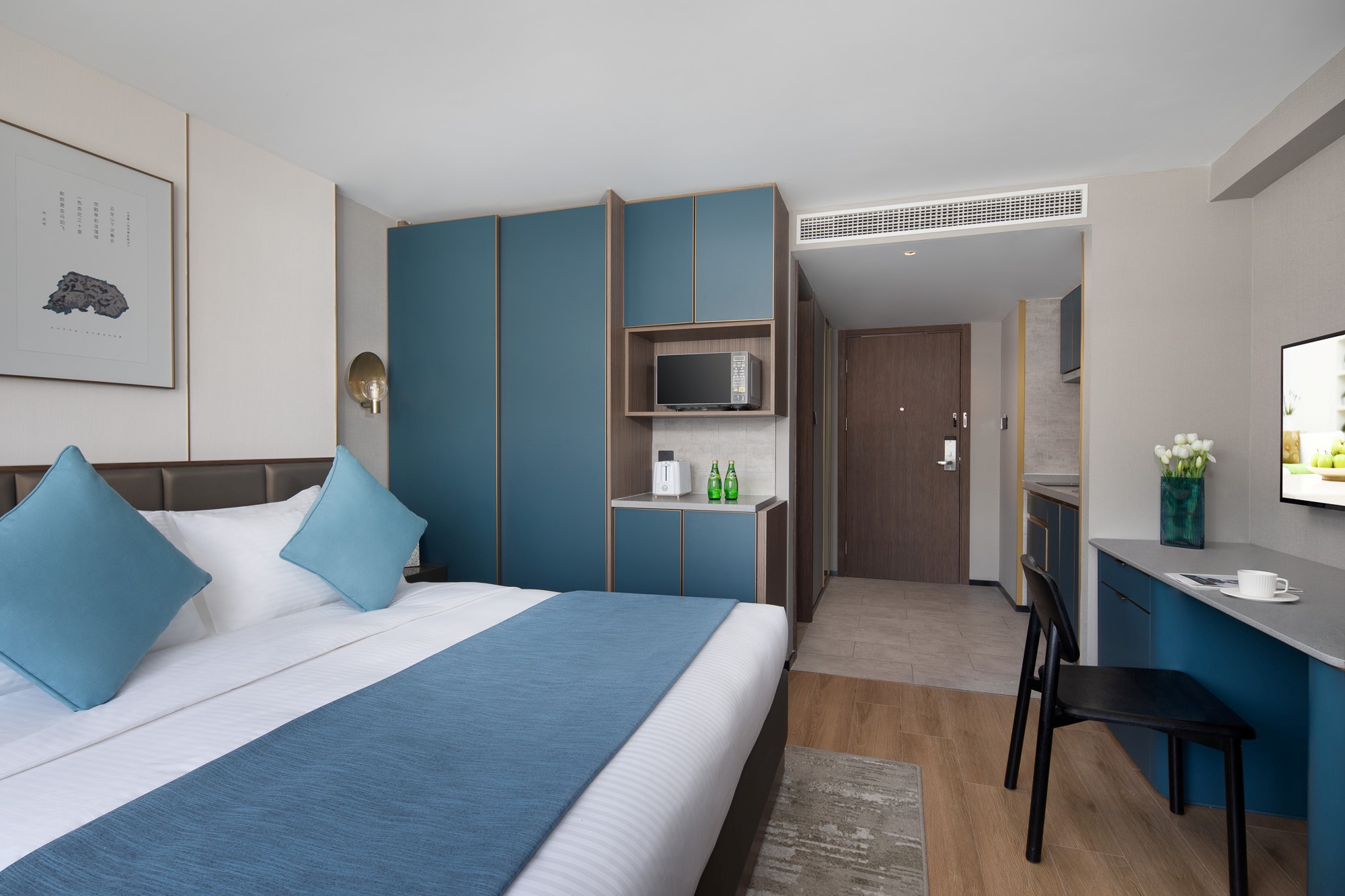 Citadines Yunlong Lake Xuzhou is uniquely designed in the shape of a cruise ship anchored by Yunlong Lake, perfectly blending with the mountains and lakes nearby. The inner space of the residence is lavishly designed, inspired by Su Shi, one of the greatest poets of all times, citing his poem “Trying spring clothes under Yunlong Mountain, is like 30 miles of apricot blossoms in one color”. The design uses the concept of Yunlong Mountain, Yunlong Lake and apricot blossoms as the main theme, aiming to create a poetic and cultural atmosphere akin to wandering through lakes and mountains. The residence offers 110 stylish and elegant apartments, ranging from Studio Deluxe to Two-bedroom Deluxe. Each apartment provides independent living room and dining area, fully-equipped kitchen, high-quality home entertainment system and high-speed Wi-Fi connections. The 24-hour security service and CCTV system are also here to ensure the satety and privacy for our guests.