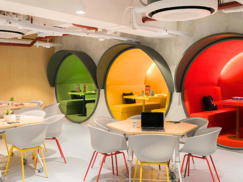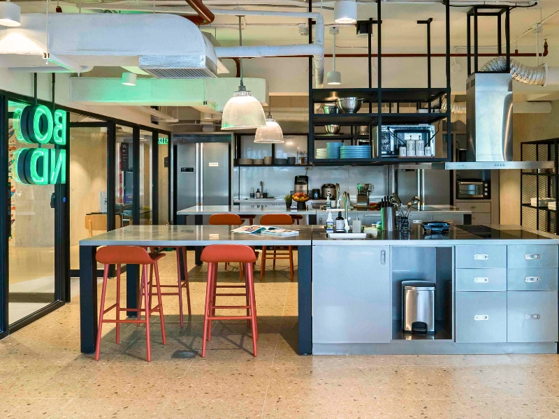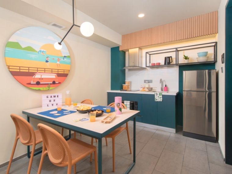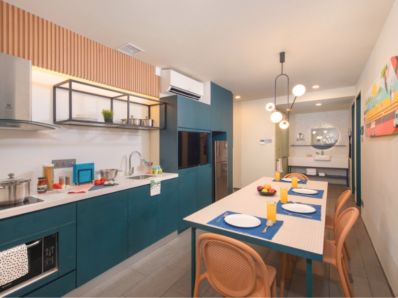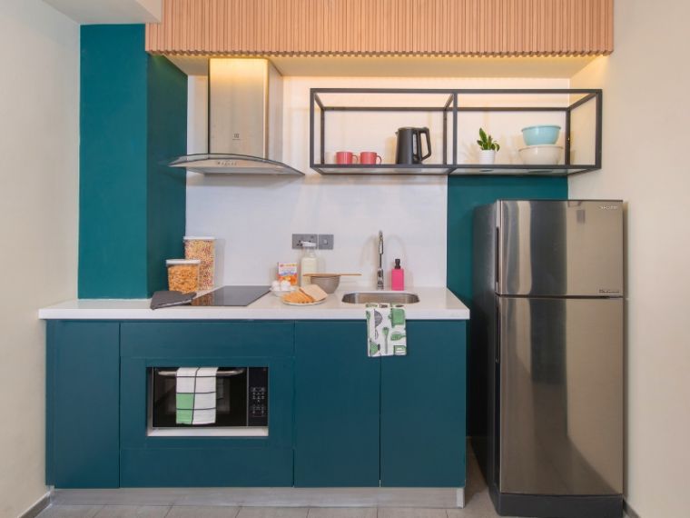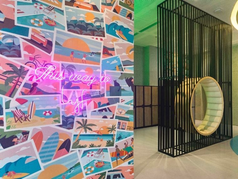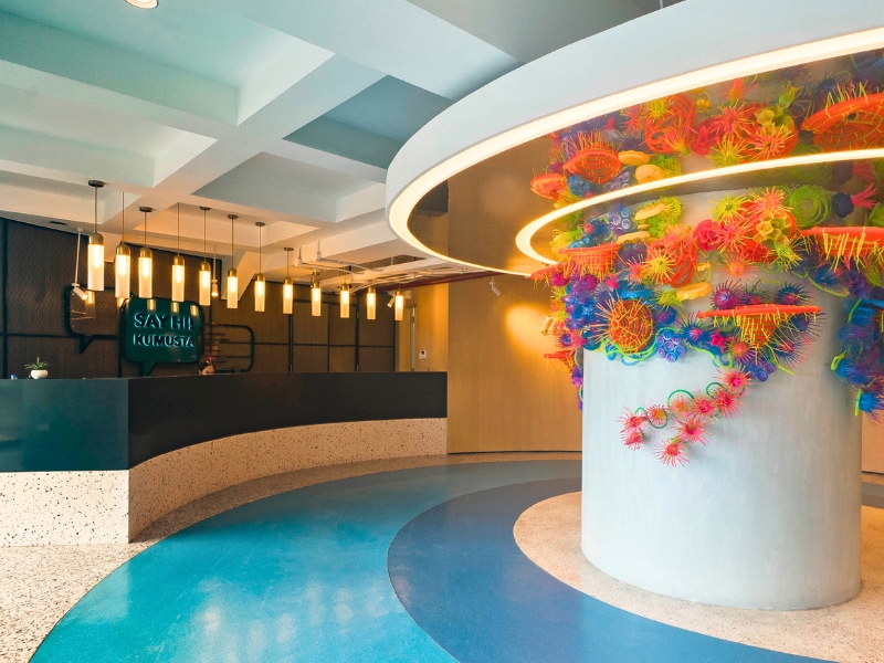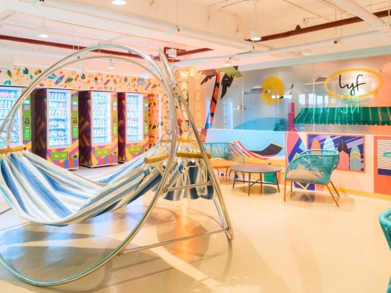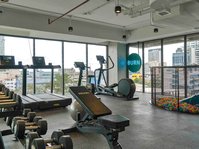 The experience at lyf Cebu City is further elevated with its unique social spaces. Adapting to the social facet of traveling and indoor stays, amenities are given their own distinct character: Say Hi, Bond, Chill, Burn, Wash & Hang. Say Hi serves as the reception and check-in area, located in a brightly-colored lobby. Bond is the name given to the shared kitchen, which is furnished for cooking and snacking. Chill is a coworking lounge designed for both collaborative and individual projects while Burn is the communal fitness center that encourages shared exercise.