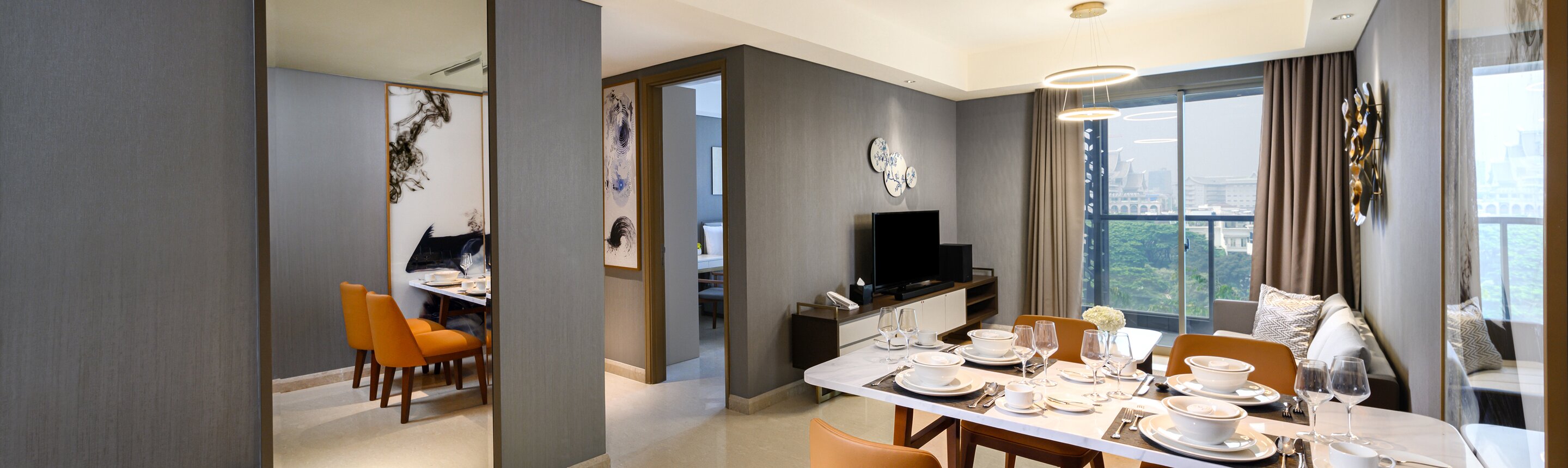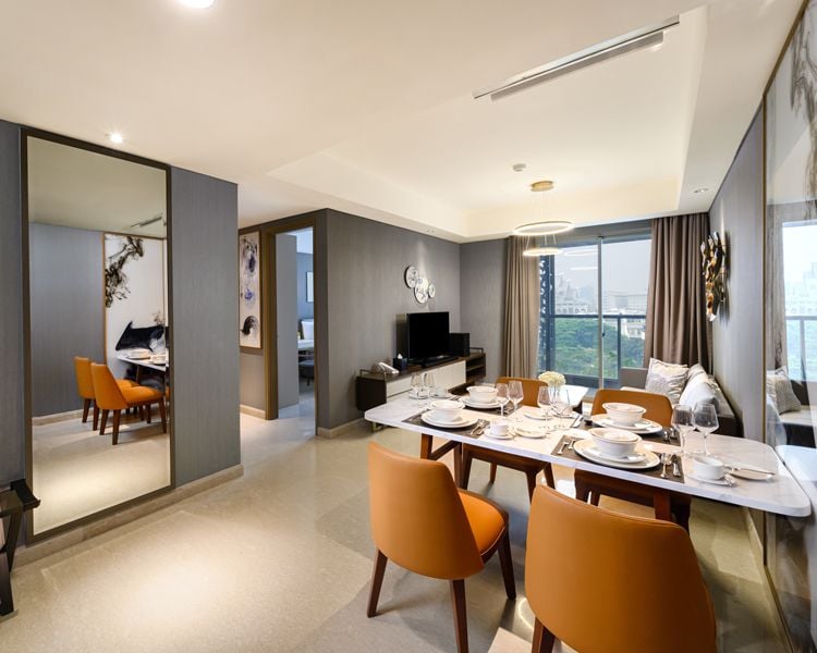 Our 200 fully furnished serviced residences are designed to offer a tranquil sanctuary with either city or garden views. Each apartment provides a true home-away-from-home experience, featuring stylish interiors and a complete suite of modern amenities. Every unit includes a fully equipped modern kitchenette (microwave, oven, and stove), allowing you to prepare your own meals. You will also find an in-suite washing machine, a home entertainment system with Smart TV, and daily housekeeping, ensuring a seamless, self-sufficient stay.
