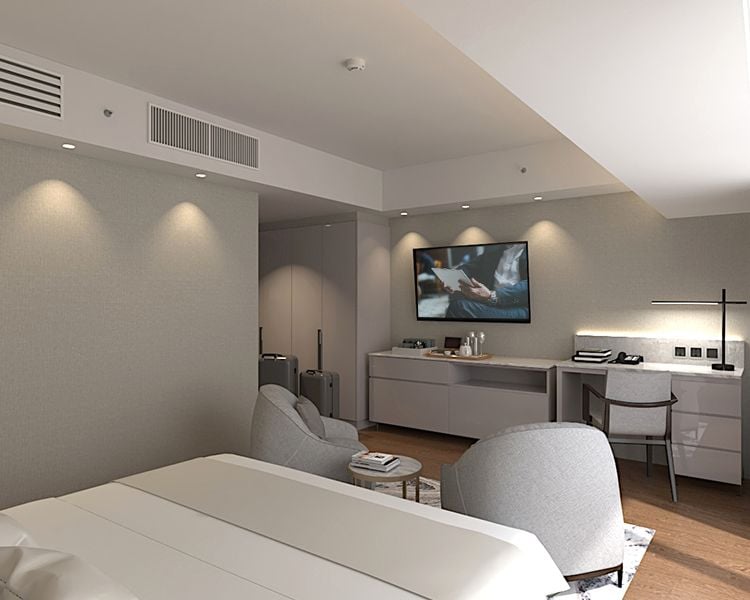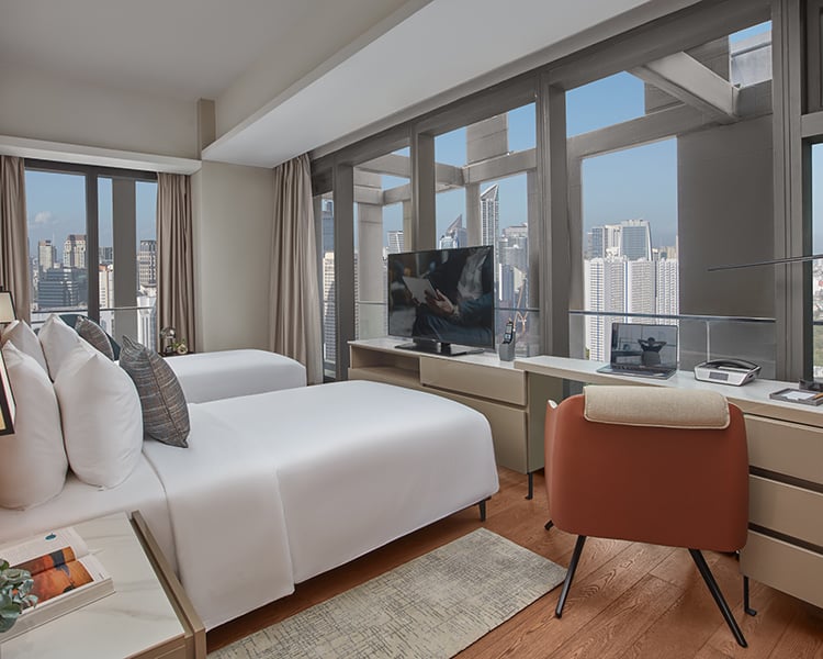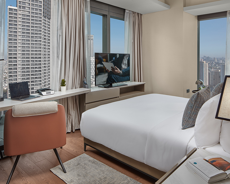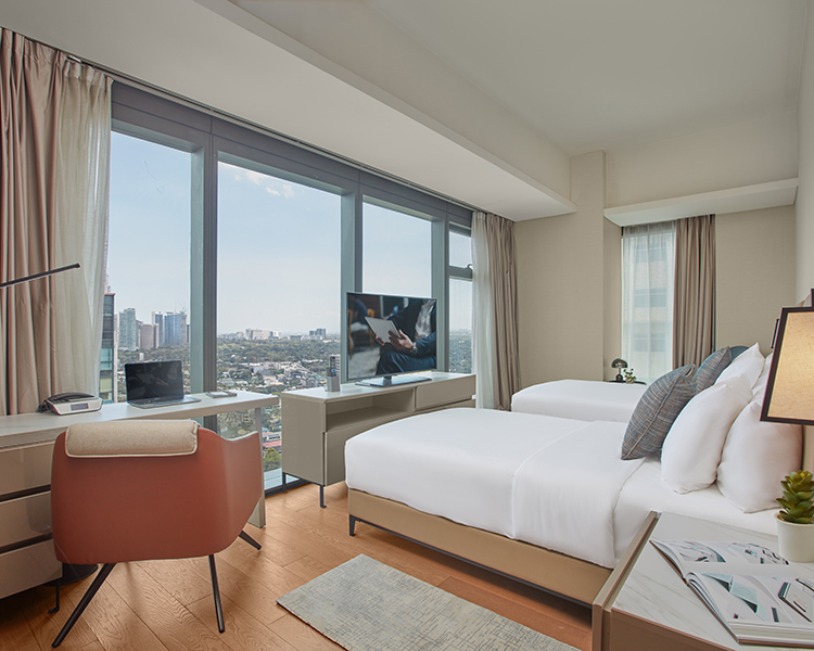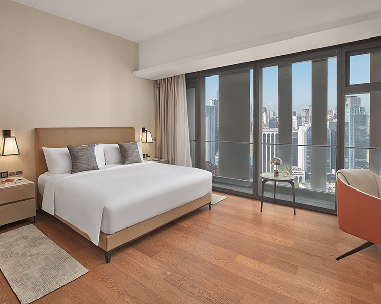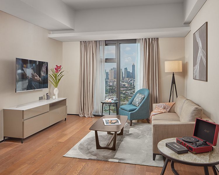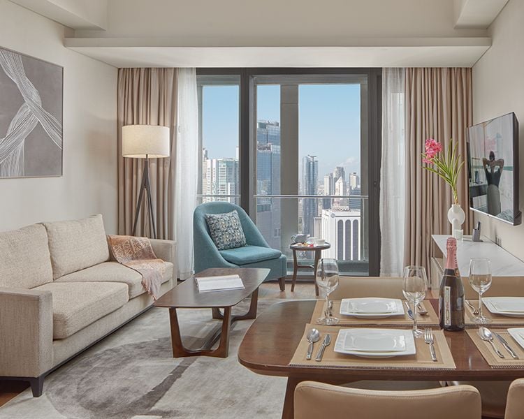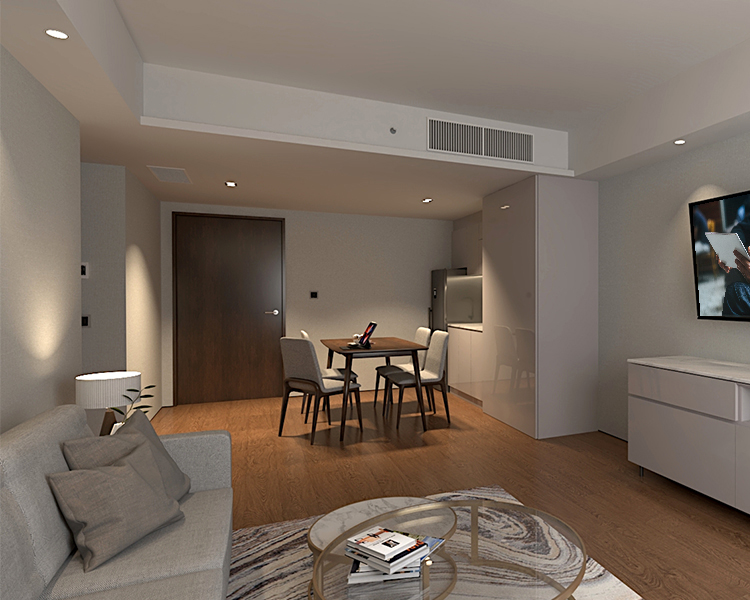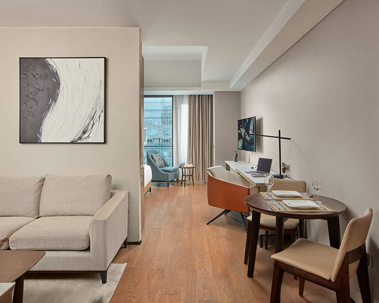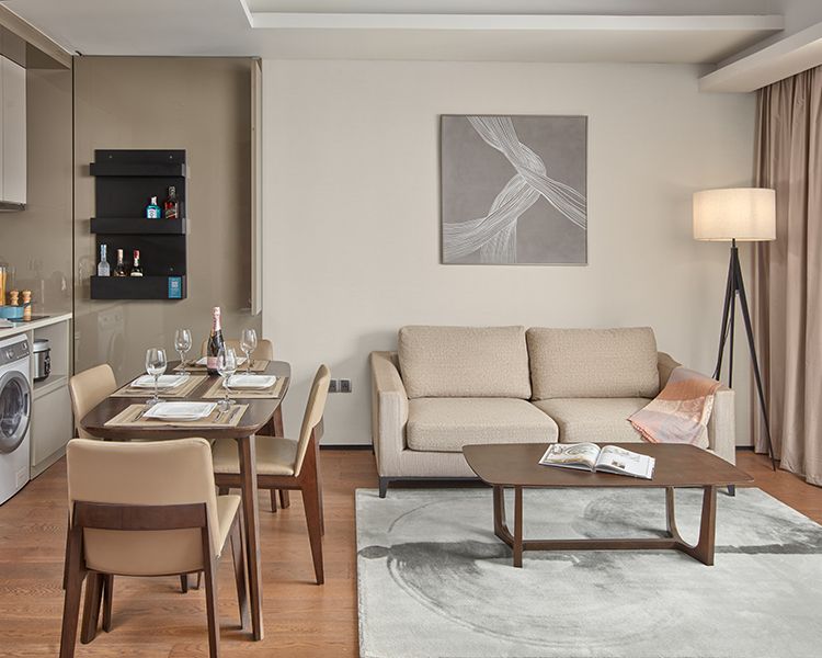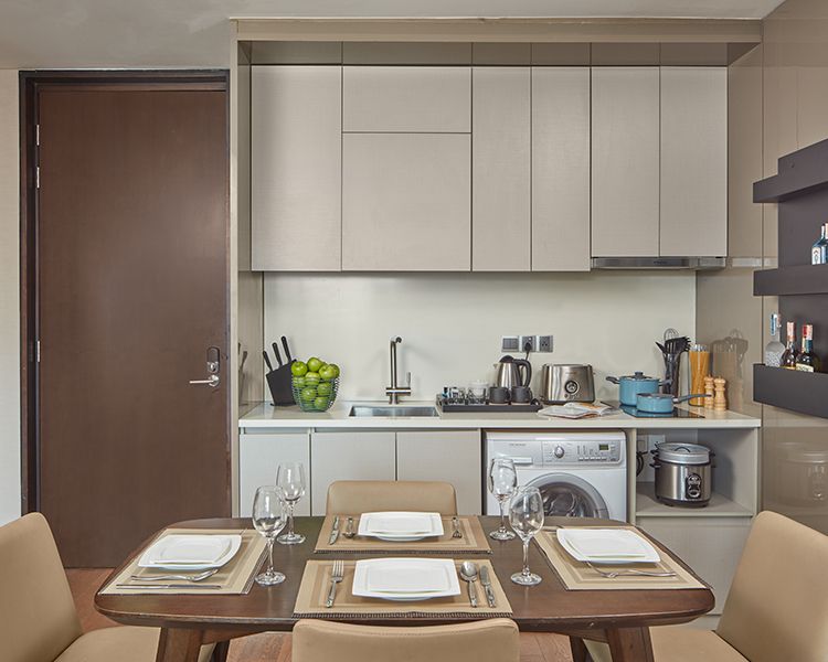 Our serviced apartments are designed for both short and extended stays, providing a blend of comfort, elegance, and convenience. Each of our 150 thoughtfully appointed rooms, ranging from spacious studios to expansive two-bedroom apartments, offers luxurious air-conditioned living with captivating city views. Guests will appreciate the modern amenities, including a fully equipped kitchenette, a dedicated work desk, and complimentary WiFi. For added residential convenience, select suites also include an in-suite washing machine and dryer.